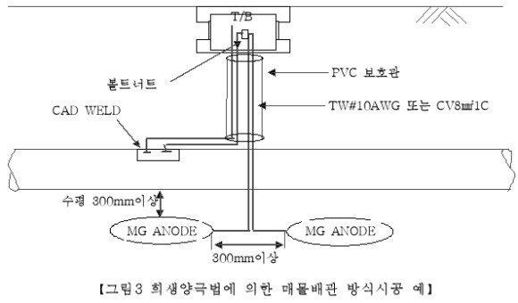- 양극의 리드선과 배관에 연결된 측정용 전선의 굵기는 TW#10AWG (단선의 외경 2.588㎜ 이상) 또는 CV 8㎟ 1C 이상으로 설치